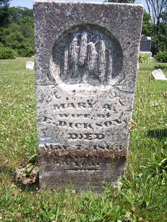 | Dickson, Mary A., wife of E., died May 7, 1863 aged 55y Six Corners Cem |